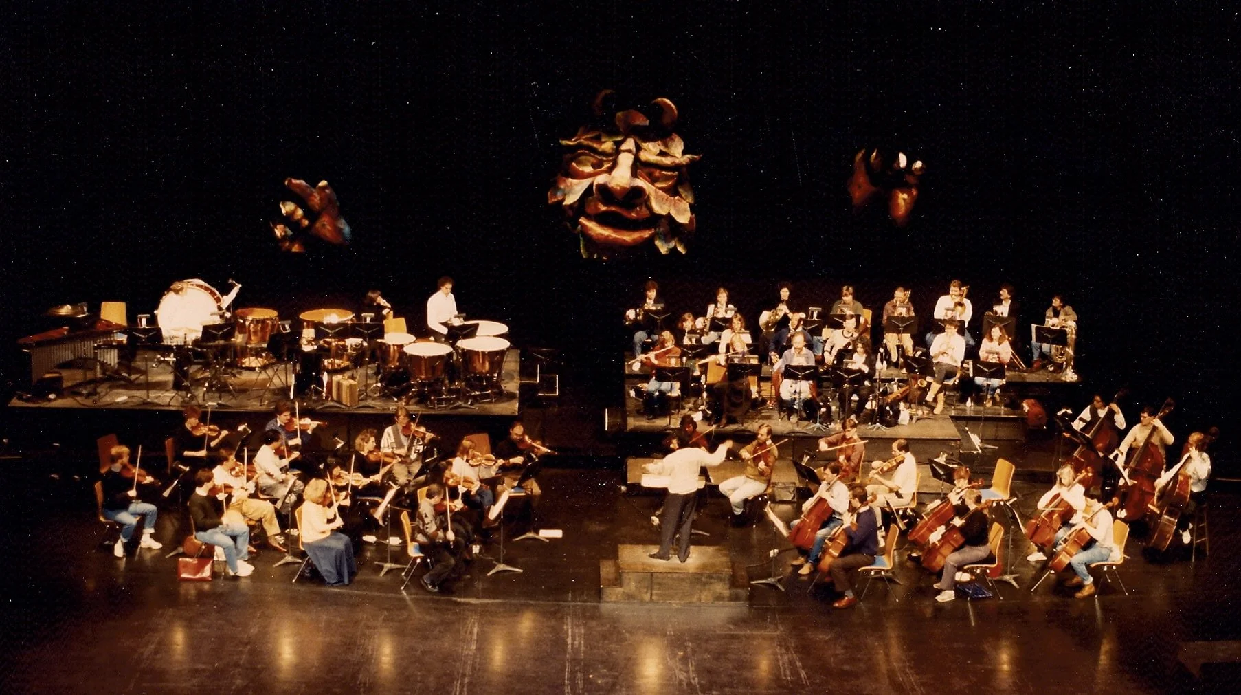 It’s hard to believe that it’s already been more than a third of a century since a 40-foot monster reared its head behind the Kitchener-Waterloo Symphony in the very first performance of “Emily Saves the Orchestra”. (I’ve pasted a photo from the dress rehearsal of that performance below.) At the time, my brother Michael and I intended the concert to be a one-off after which we would both go back to our regular lives, he as the Artistic Administrator of the KWS and me as a freelance actor. Funny how life has its own plans for us.