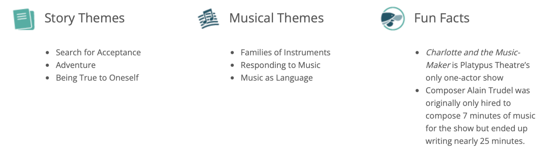 Each Platypus children’s concert is tailored to fit both the primary (kindergarten to grade 3) and junior (grade 4 to 6) divisions. Our in-depth and relevant study guides were developed by teachers, with separate activities by grade level and curriculum that meet or exceed most provincial and state standards for arts education.